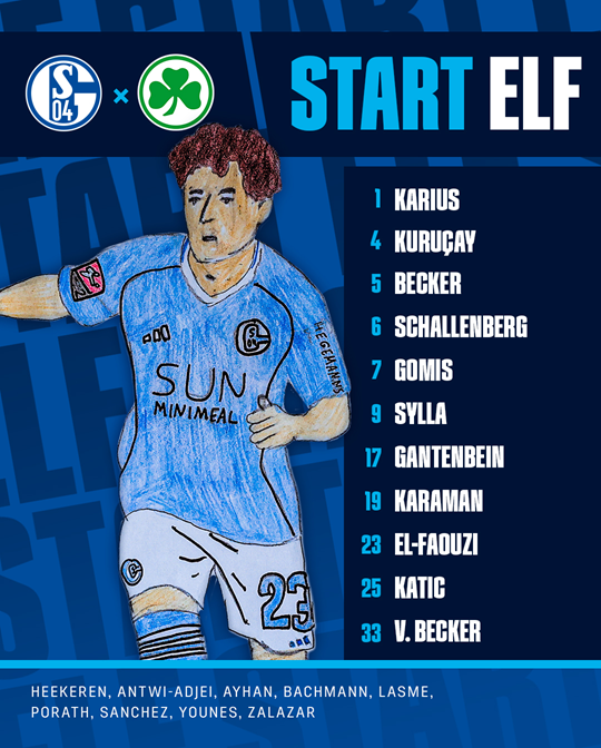 (画外音)北京时间零点三十分,德乙联赛第七轮激战正酣,沙尔克坐镇主场迎战菲尔特。此刻,让我们先来了解一下双方的首发阵容——沙尔克首发名单:门将位置:一号卡里乌斯,严阵以待!后卫线:五号贝克尔、二十五号卡蒂奇、四号库鲁凯,构筑钢铁防线!中场方面:十七号甘滕拜因、二十三号法乌齐、十九号卡拉曼(队长)、六号沙伦贝格、三十三号维塔利·贝克尔,掌控中场节奏!前锋组合:七号戈米、九号西拉,锋线双煞蓄势待发!沙
